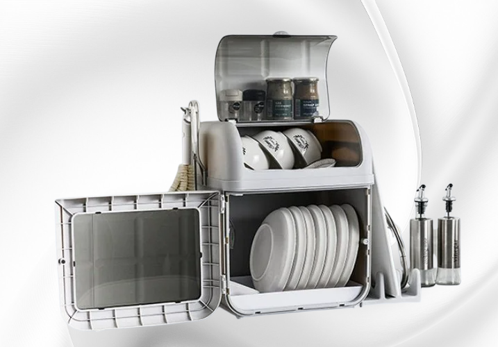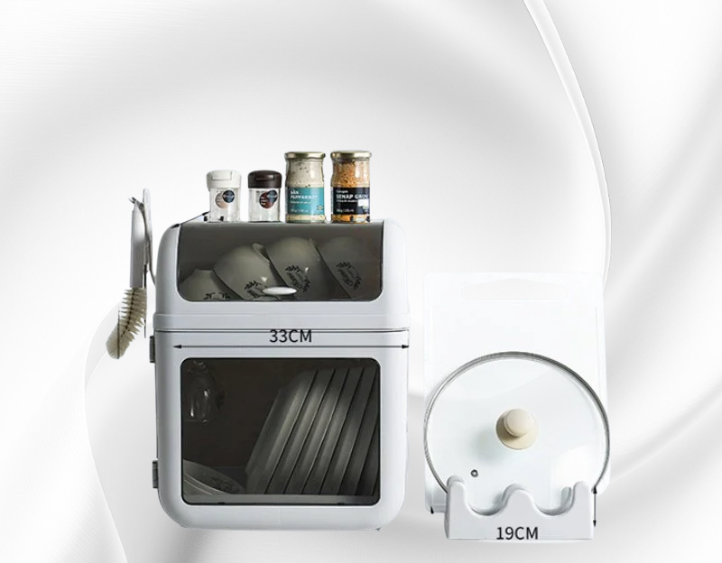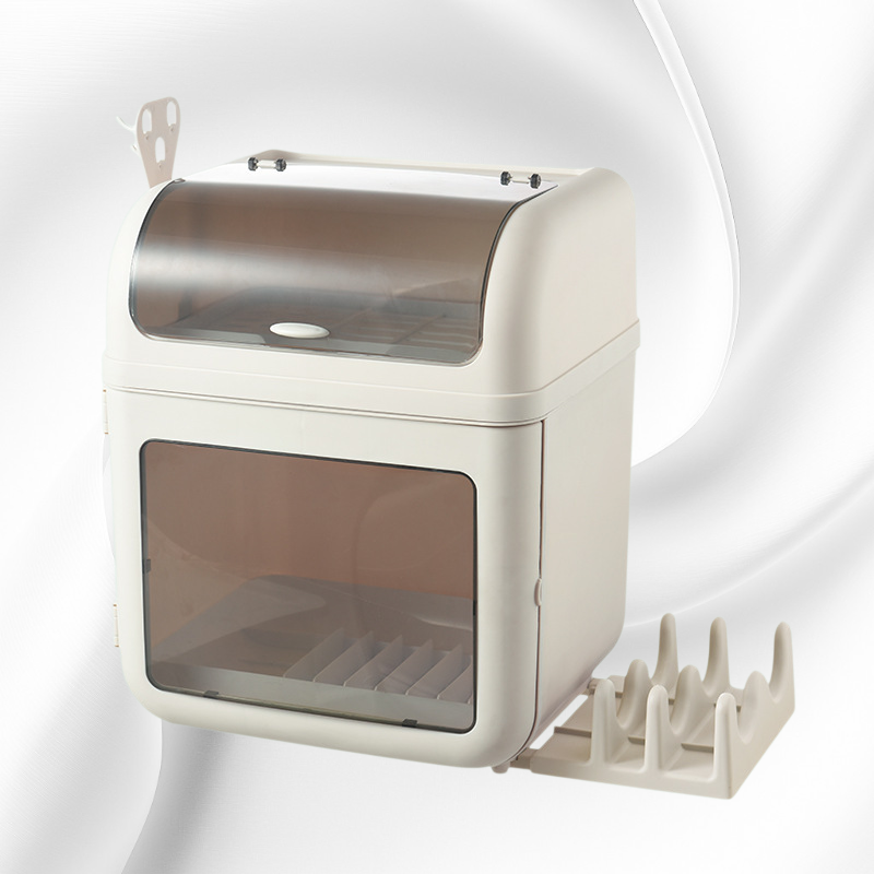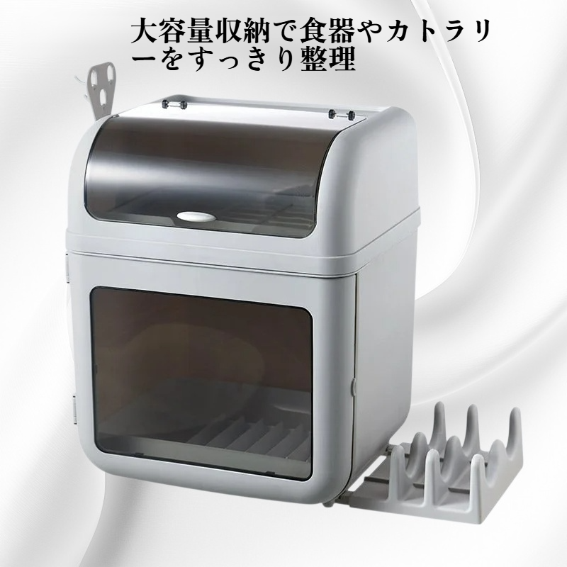 大容量設計で多くの食器やカトラリーをすっきり収納。水切りトレー付きで衛生的。キッチン整理に最適な省スペース仕様。