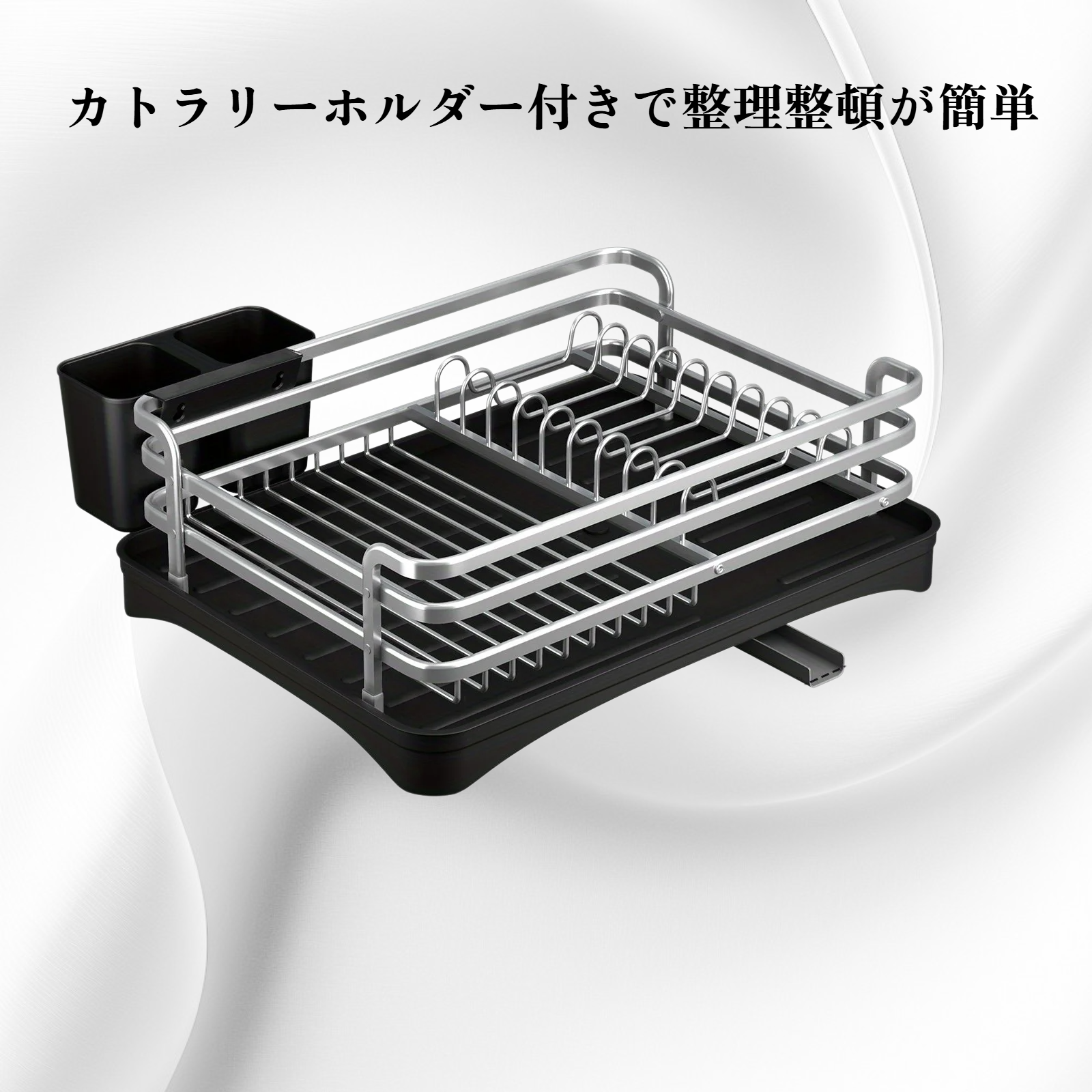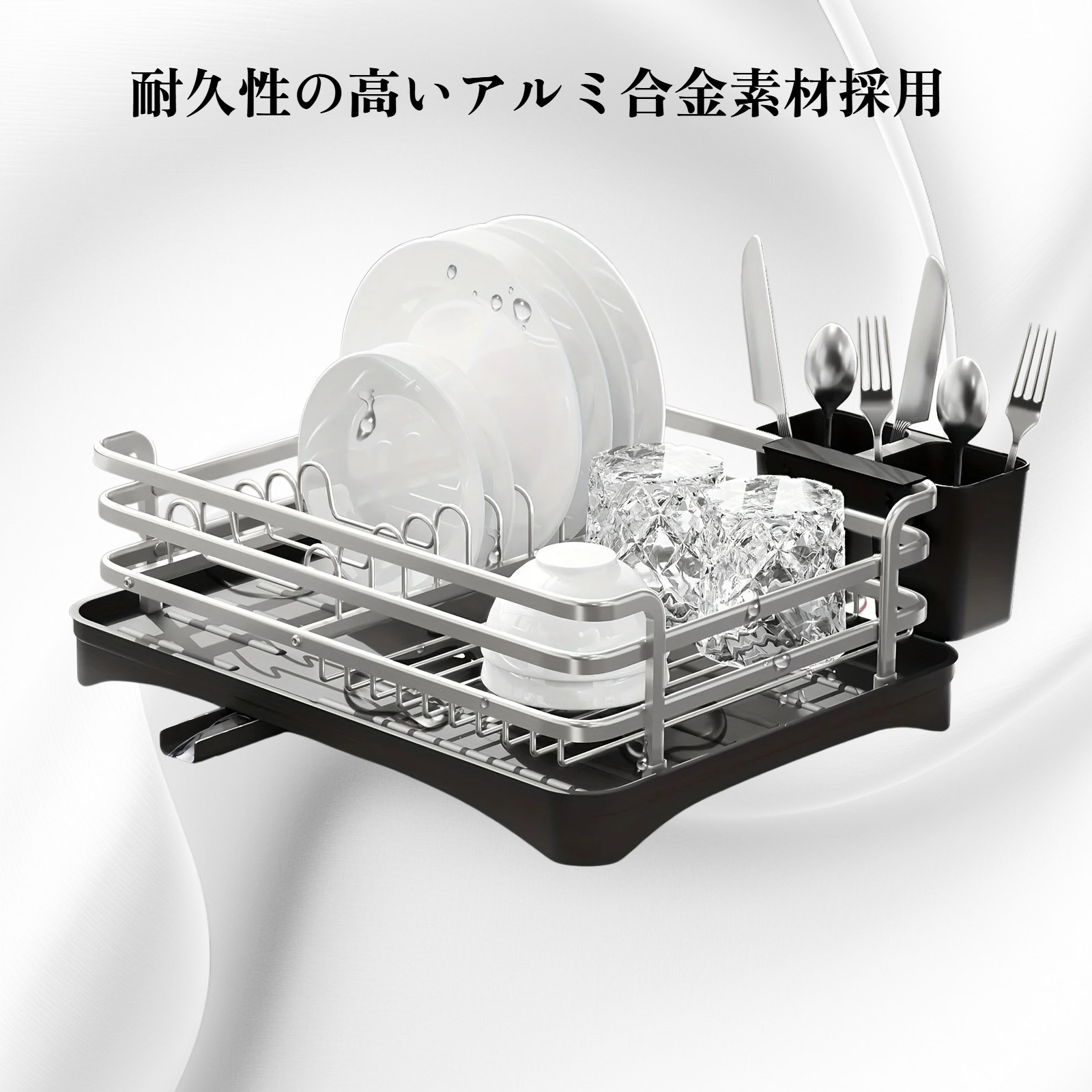 耐久性の高いアルミ合金素材採用。水切り効果抜群。カトラリーホルダー付きで整理整頓が簡単。省スペース設計、家庭用収納に最適。